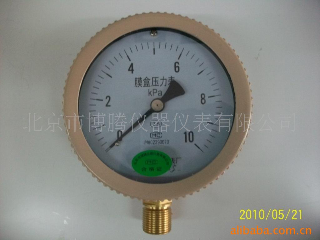 膜盒压力表采用膜盒作为测量微小压力的敏感元件。测量对铜合金不起腐蚀作用,无爆炸作用,无爆炸危险气体的微压和负压,广泛应用于锅炉通风,气体管道,燃烧装置等及其它类似设备。 精度等级2.5级 测量范围:0-1.6-0-60MPa, 0-250-0-40000Pa正负压,负压。